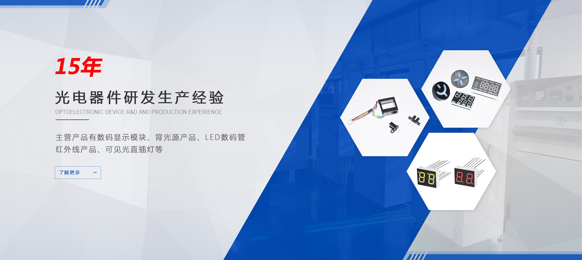 主營(yíng)產(chǎn)品有數(shù)碼顯示模塊、背光源產(chǎn)品、LED數(shù)碼管、紅外線產(chǎn)品、可見光直插燈等,主要用于日常生活電器:冰箱、空調(diào)、洗衣機(jī);交通工具:汽車、動(dòng)車、飛機(jī);工業(yè)設(shè)備、儀器儀表等廣范領(lǐng)域。